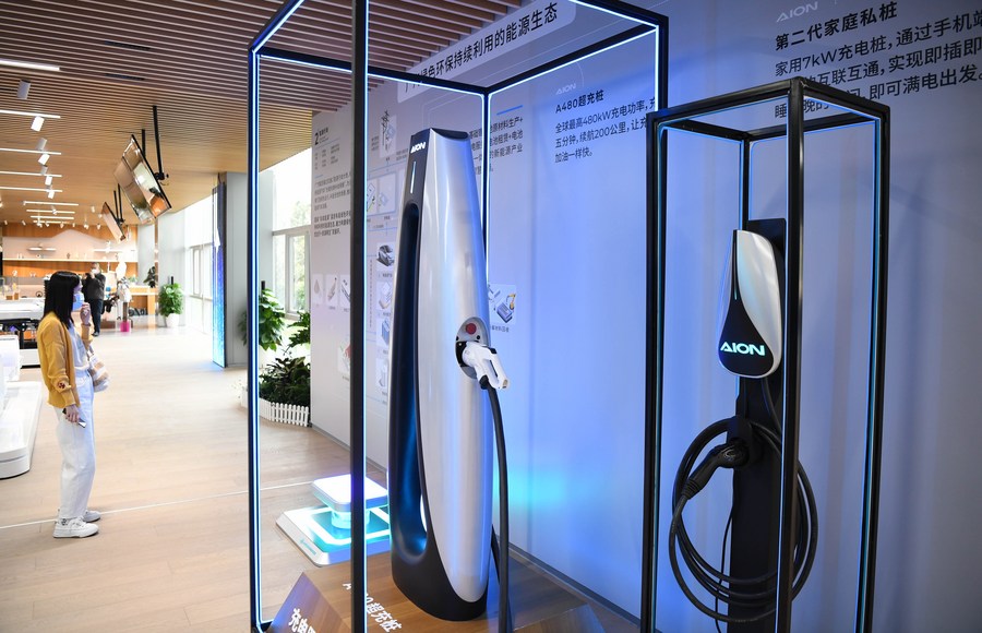 This photo taken on Feb. 24, 2023 shows the charging piles displayed at GAC Aion, an NEV subsidiary of Guangzhou Automobile Group Co., Ltd. (GAC Group), in Guangzhou, south China’s Guangdong Province. (Photo/Xinhua)