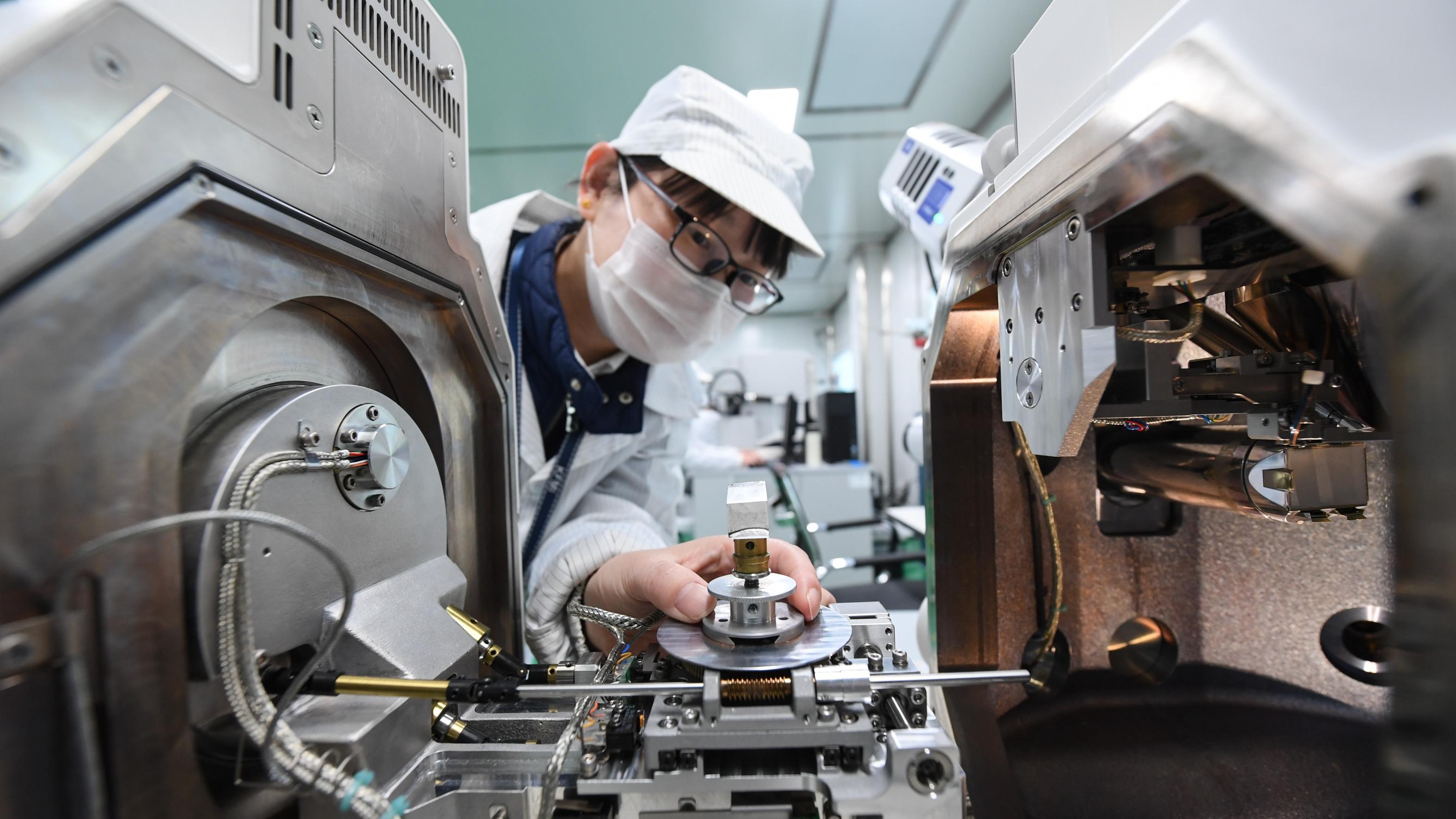 A staff member inspects raw material used in chip manufacturing at a testing center of an electronics firm in Ningbo, Zhejiang province, on Mar. 21, 2023. (Photo/Xinhua)