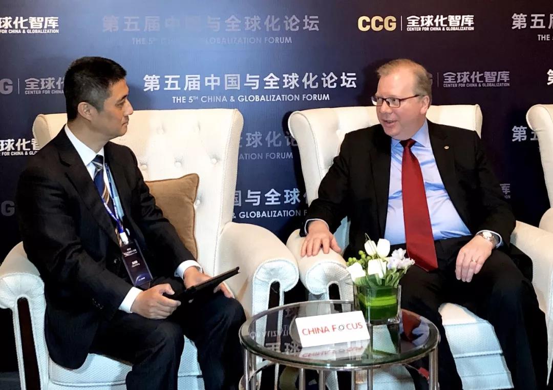 Mr Gao Anming, Vice President of China International Publishing Group interviews H.E. Nicholas Rosellini (R), UN Resident Coordinator in China about the Belt and Road Initiative at the 5th China and Globalization Forum in Beijing on April 15, 2019.