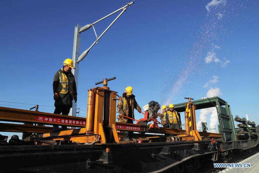 Workers lay railway tracks in Chaoyang City, northeast China’s Liaoning Province, Nov. 30, 2020. (Photo/Xinhua)