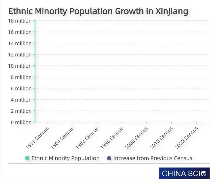 Statistics from a white paper titled “Xinjiang Population Dynamics and Data” show that the ethnic population has been growing steadily and significantly over the past seven decades, jumping from less than 4.5 million in 1953 to nearly 15 million in 2020.