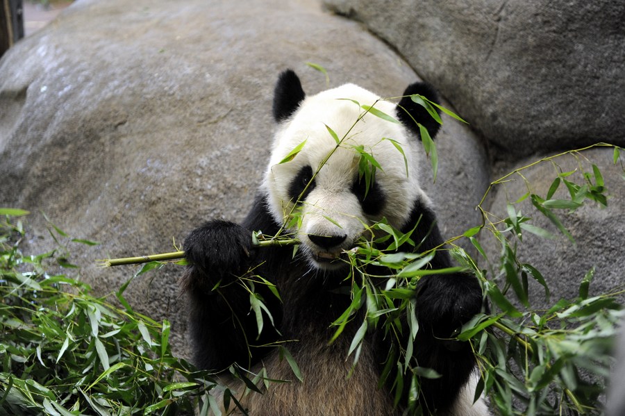 Chinese giant panda Le Le eats bamboo leaves in its enclosure at the Memphis Zoo in Memphis, Tennessee, the United States, Aug. 13, 2010. (Photo/Xinhua)