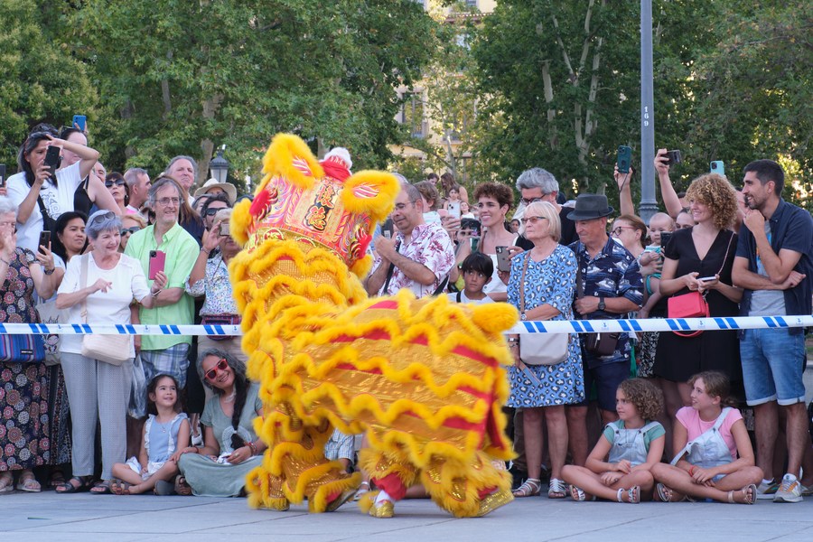 People watch lion dance at the Plaza de Oriente (Eastern Plaza) in Madrid, Spain, on Aug. 5, 2023. (Photo/Xinhua)