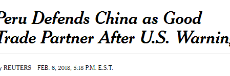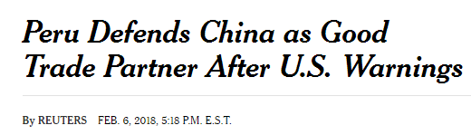 ▲Peru’s trade minister Eduardo Ferreyros defended China as a good trade partner, after U.S. Secretary of State Rex Tillerson warned Latin American countries against excessive reliance on economic ties with the Asian powerhouse, as reported by New York Times on 6th February.