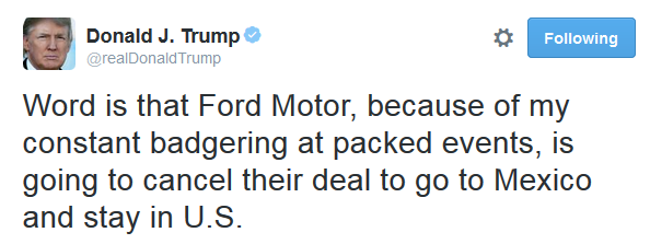Donald Trump tweeted his success in personally persuading Ford Motor Company to abandon its plan to invest in and build a factory in Mexico.