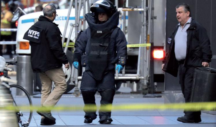 Δ?A member of the New York Police Department bomb squad is pictured outside the Time Warner Center in New York after a suspicious package was found inside the CNN Headquarters in Manhattan on Wednesday.