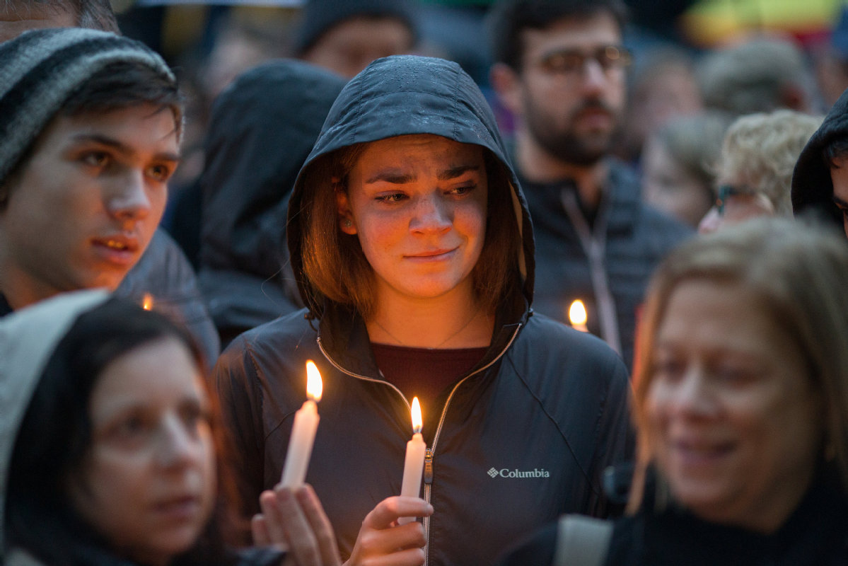 Δ?People mourn as they hold a vigil for the victims of the synagogue shooting in Pittsburgh, Pennsylvania, on Oct. 27. John Altorfer/REUTERS?