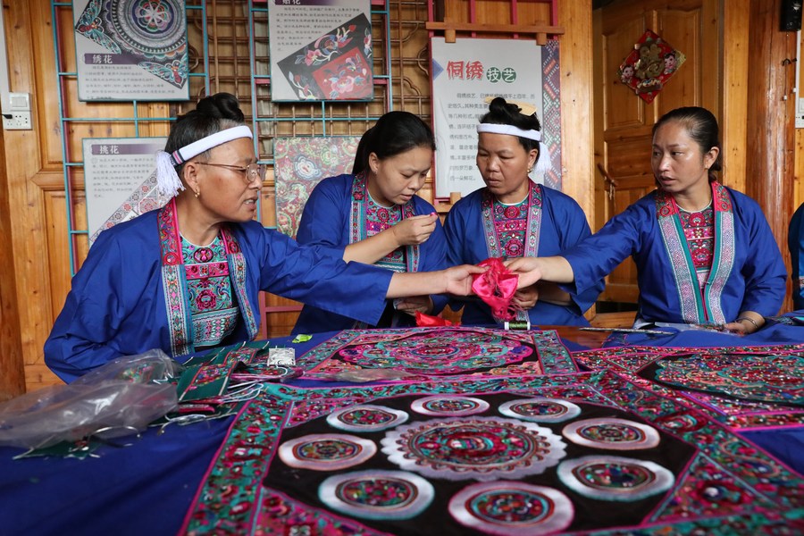 Local women study Dong embroidery in Tongle Township of Sanjiang Dong Autonomous County in south China’s Guangxi Zhuang Autonomous Region, Aug. 7, 2020. (Photo/Xinhua)