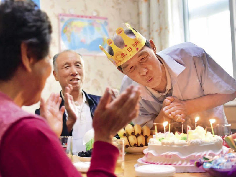 Volunteers celebrate the 83rd birthday of Yuwen Zhong in their neighborhood in Puyang City, Henan Province, on May 26, 2019.