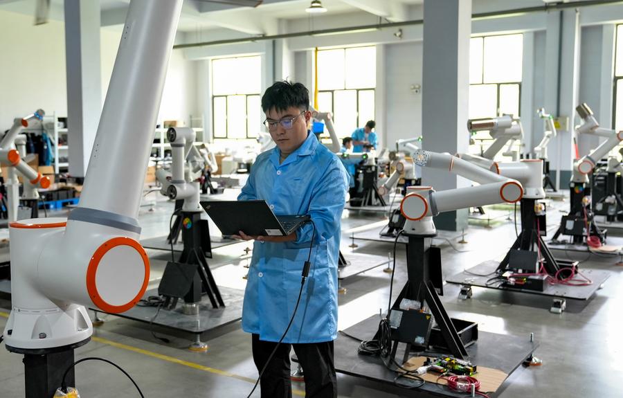 A technician adjusts robots at a workshop in Zibo City, east China’s Shandong Province, May 12, 2024. (Photo//Xinhua)
