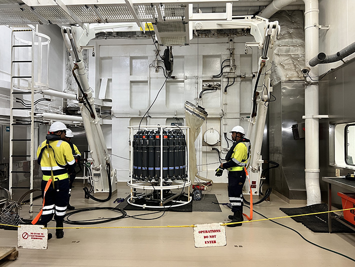 Under the command of Ashley Johnson, the iron gate on the starboard side of the?S.A. Agulhas II?vessel opened slowly, and the paired bongo nets, supported by a mechanised framework, gradually sank 100 metres into the sea. After being towed for a while, they were retrieved, and scientists on board sampled the plankton collected for analysis. Simultaneously, the bongo nets also gathered data on temperature, salinity, conductivity, and depth. Following this, the scientists deployed Niskin bottles to collect water samples from various depths.
