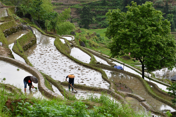 Photo taken on May 27, 2022 shows farmers working in Ziquejie Terraces in Xinhua county, Central China’s Hunan province. (Photo/Xinhua)