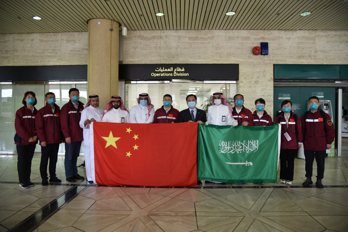 Chinese medical experts pose for a photo with local doctors at the King Khalid International Airport in Riyadh, Saudi Arabia, on April 15 (Photo/Xinhua)