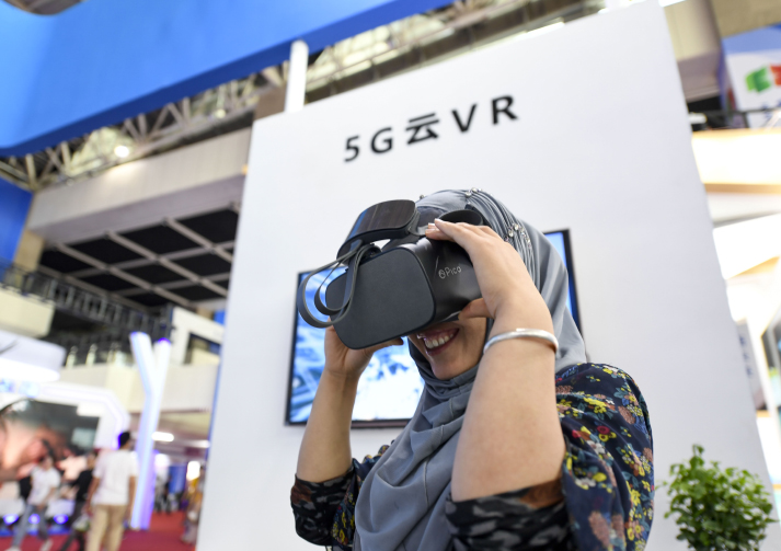 A visitor tries on a 5G-based virtual reality device at an exhibition of hi-tech equipment during the Fourth China-Arab States Expo in Yinchuan, Ningxia Hui Autonomous Region in northwest China, on September 6, 2019 (Photo/Xinhua)