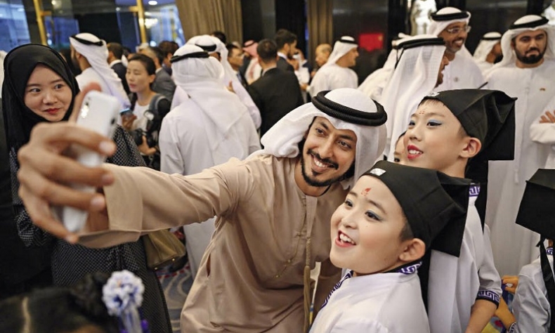 A commemorative event honoring the 35th anniversary of the establishment of diplomatic relations between China and the United Arab Emirates is held in Beijing on July 23, 2019. In the picture, an Arab participant is taking a selfie with Chinese young performers.