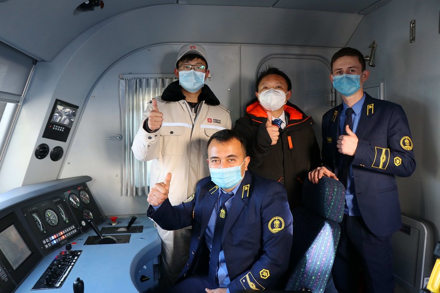 Chinese technicians pose for a photo with Uzbek drivers on an electric locomotive in Tashkent, Uzbekistan, Dec. 17, 2020. (Photo/Xinhua)