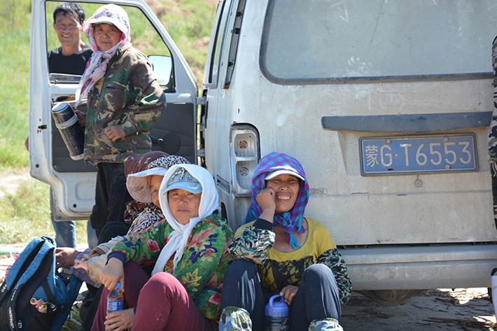 Locals taking part in a sandy land restoration programme rest in the shade of a vehicle in the Horqin Sandy Land in Tongliao, Inner Mongolia Autonomous Region. (Photo/Courtesy)