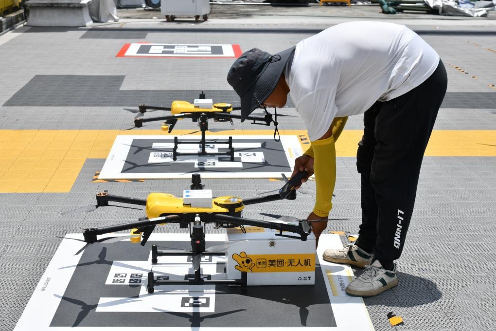 A staff member prepares unmanned food delivery drones in Shenzhen, south China’s Guangdong Province, Aug. 15, 2023. (Photo/Xinhua)