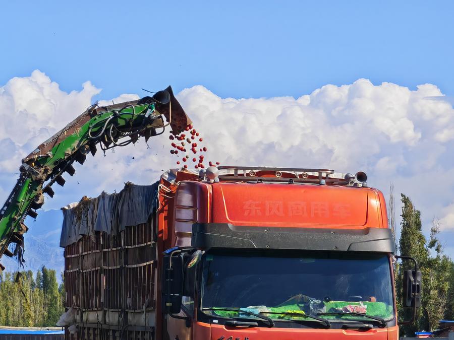 This photo taken with a mobile phone shows a picker harvesting tomatoes in Bole, northwest China’s Xinjiang Uygur Autonomous Region, Sept. 12, 2024. (Photo/Xinhua)