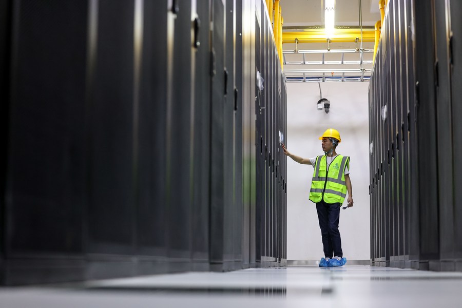 A staff member checks equipment at a data center of China Mobile in southwest China’s Guizhou Province, May 24, 2022. (Photo/Xinhua)