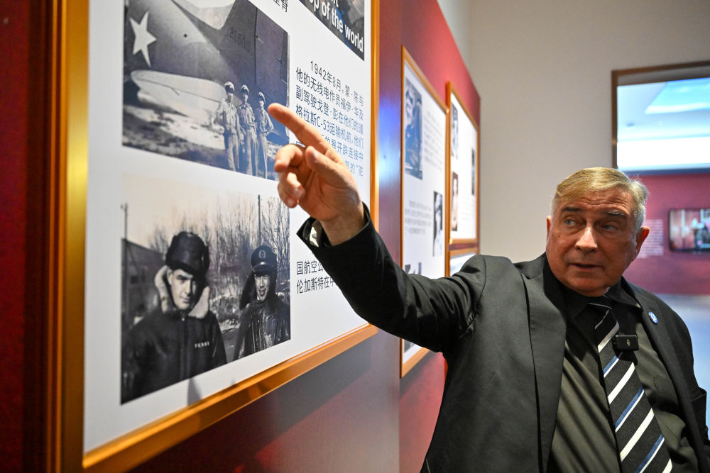 Jeffrey Greene, chairman of the Sino-American Aviation Heritage Foundation, gestures as he visits a photo exhibition dedicated to the Flying Tigers in Urumqi, capital of Northwest China’s Xinjiang Uygur autonomous region, Nov. 30, 2024. (Photo/Xinhua)