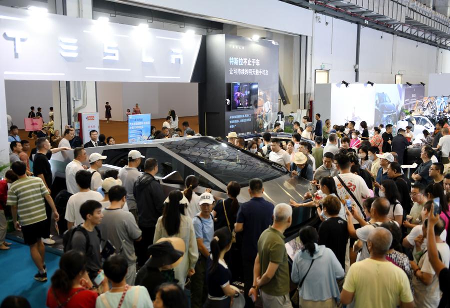 People visit a booth of Tesla at the 5th China International Consumer Products Expo (CICPE) in Haikou, south China’s Hainan Province, Apr. 17, 2025. (Photo/Xinhua)