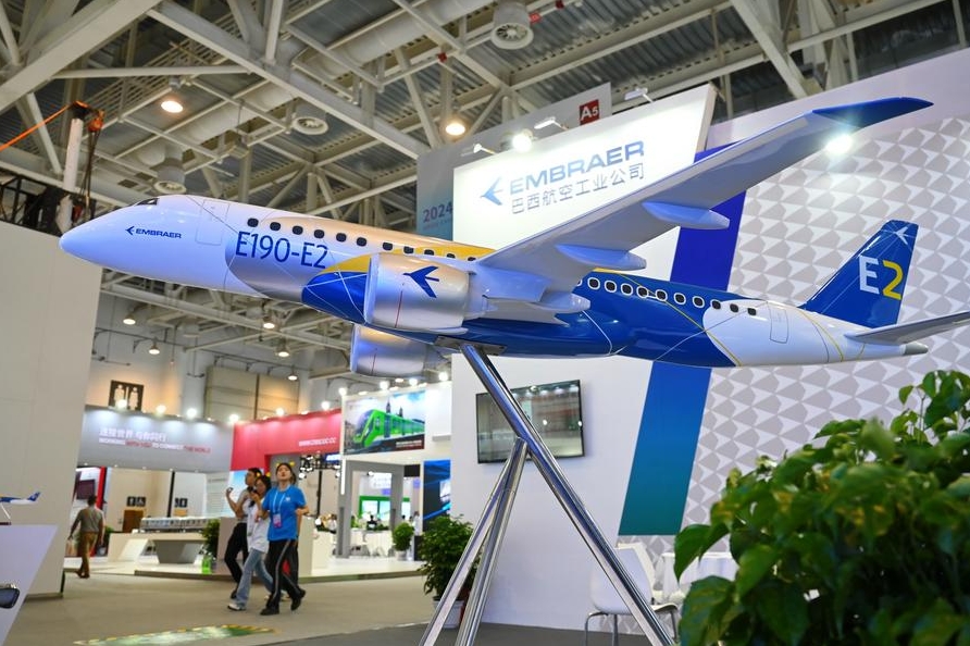 A model of E190-E2 aircraft is on display at the exhibition of BRICS New Industrial Revolution 2024 in Xiamen, southeast China’s Fujian Province, Sept. 10, 2024. (Photo/Xinhua)