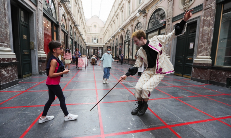 An artist plays a grid game with a girl at the Royal Gallery of Saint Hubert in Brussels, Belgium, July 15, 2020. [Photo/Xinhua]