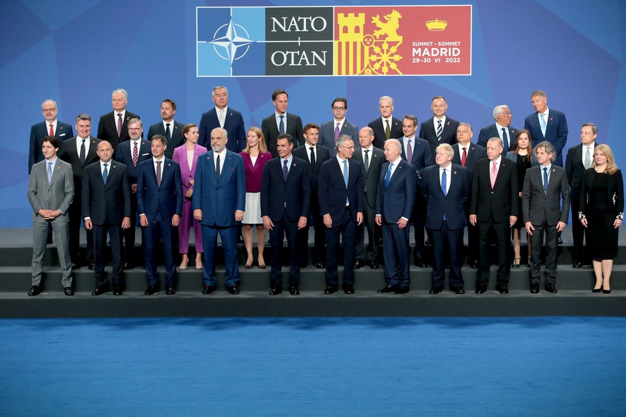 Participants of the 2022 Summit of the North Atlantic Treaty Organization (NATO) pose for a group photo in Madrid, Spain, Jun. 29, 2022. (Photo/Xinhua)