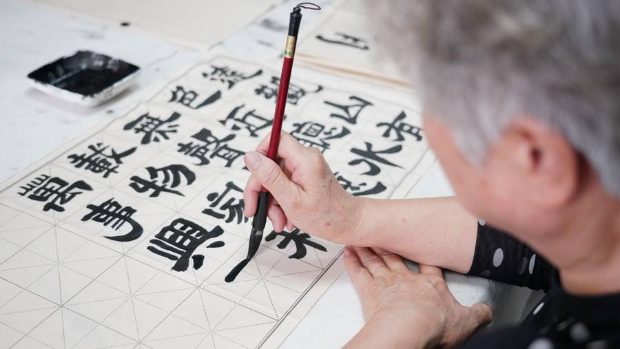 An elderly woman practices calligraphy at a daycare center in Korla City, northwest China’s Xinjiang Uygur Autonomous Region, Sept. 24, 2021. (Photo/Xinhua)