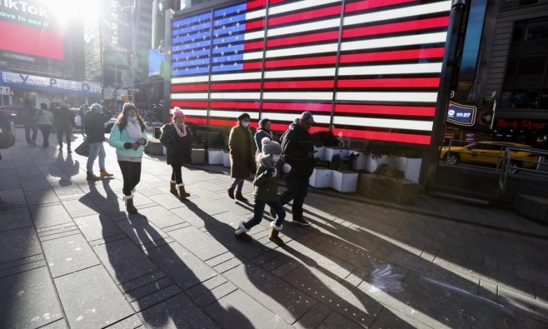 People walk through the Times Square in New York, the United States, Dec. 14, 2021.?(Photo/Xinhua)