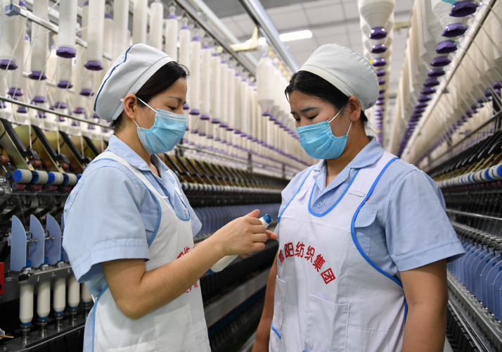 He Fei (left), a deputy to the NPC and a textile worker, interacts with a colleague in her workshop in Xianyang, Shaanxi Province in northwest China, on May 13 (XINHUA)