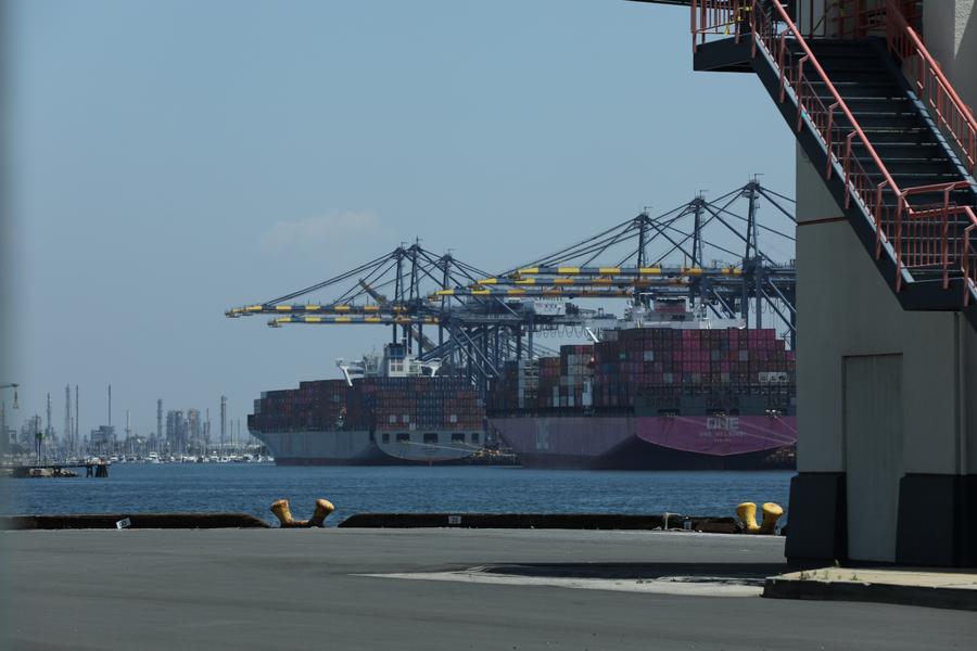 Ships loaded with containers are pictured at the Port of Los Angeles, California, the United States, on Apr. 29, 2025. (Photo/Xinhua)