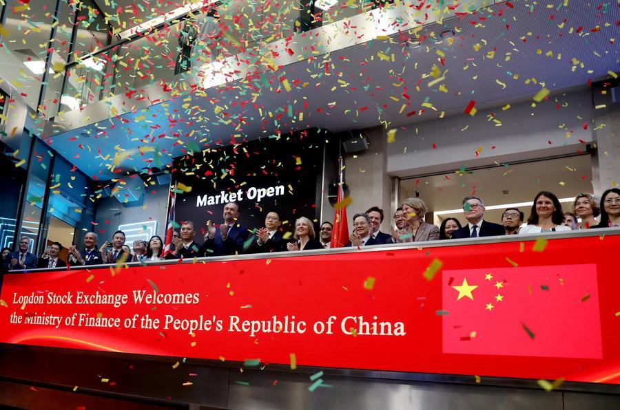 A ceremony is held at the London Stock Exchange to mark the issuance of China’s first-ever overseas RMB-denominated sovereign green bond in London, Britain, Apr. 3, 2025. (Photo/Xinhua)
