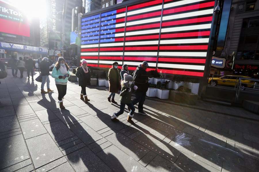 People walk on Times Square in New York, the United States, Nov. 23, 2021. (Photo/Xinhua)