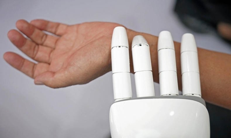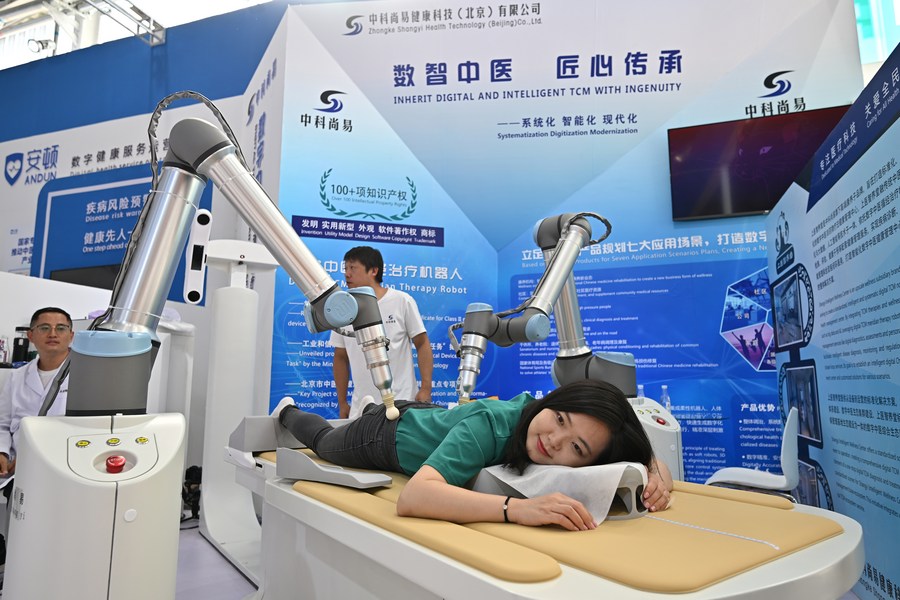 A visitor experiences a traditional Chinese medicine (TCM) therapy robot during the 2023 China International Fair for Trade in Services (CIFTIS) at Shougang Park in Beijing, capital of China, Sept. 3, 2023. (Photo/Xinhua)