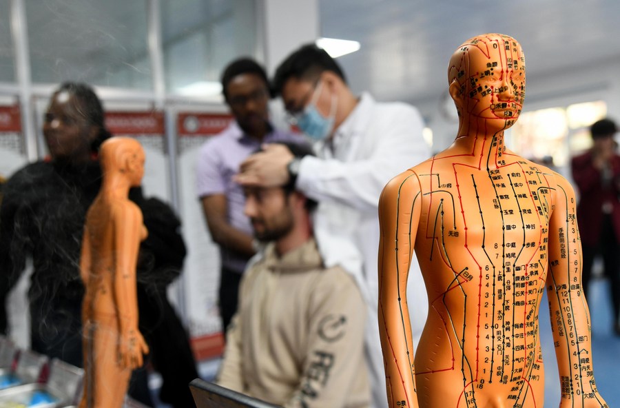 A student from China University of Petroleum experiences traditional Chinese medicine (TCM) therapy at the TCM cultural base in Huangdao Hospital of TCM in Qingdao, east China’s Shandong Province, Apr. 23, 2021. (Photo/Xinhua)