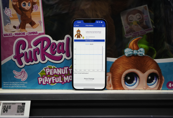 A price-tracking mobile app interface displays the price change of a Chinese-made monkey toy at a Walmart store in San Leandro, California, the U.S., on May 21, 2025. (Photo/Xinhua)