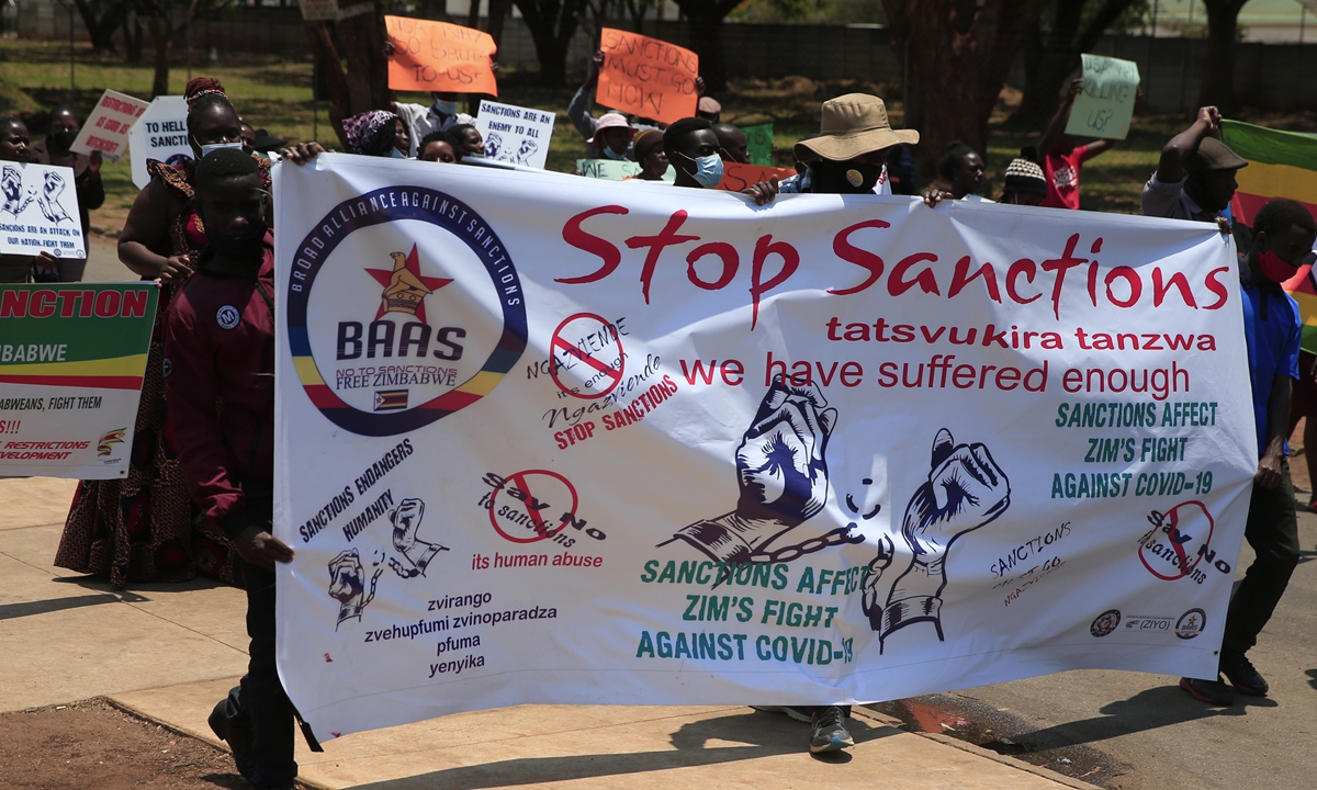 Zimbabweans protest against Western sanctions near the U.S. embassy in Harare on Oct. 25, 2021. (Photo/Xinhua)