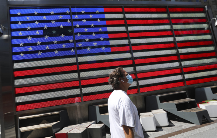 A man walks past a signboard painted in the colors of the U.S. flag at the Times Square in New York City, the U.S., on July 23 (Photo: Xinhua)