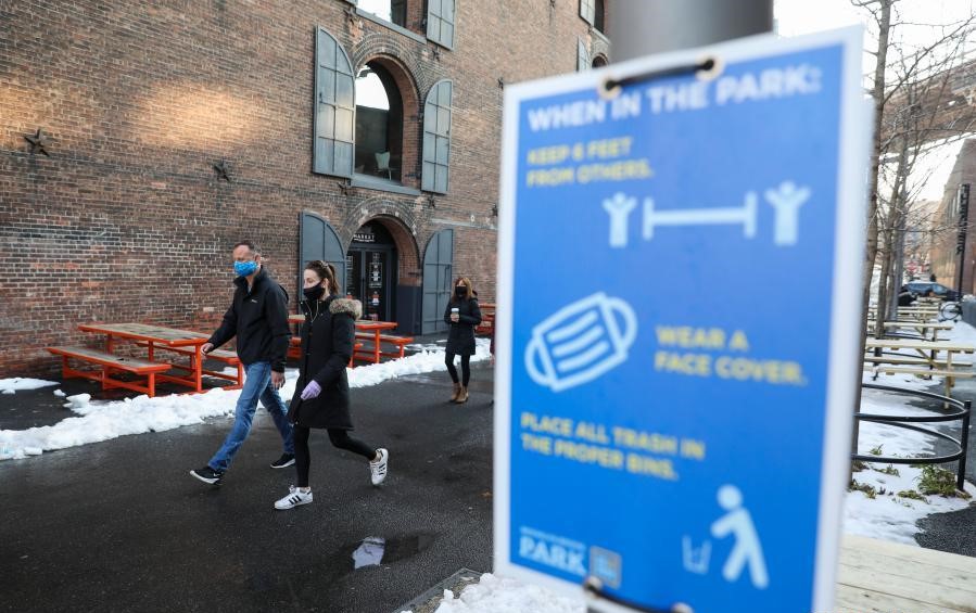 People walk past a notice of suggestions for COVID-19 prevention in a park in New York, the United States, Dec. 21, 2020. (Photo/Xinhua)