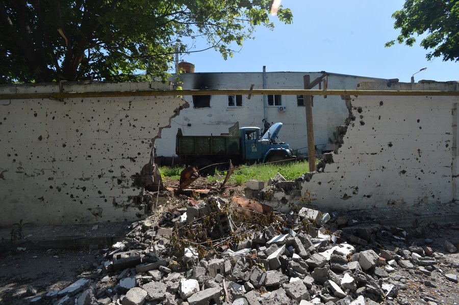Photo taken on Jun. 2, 2022 shows damaged building and vehicle in Kharkov, Ukraine. (Photo/Xinhua)