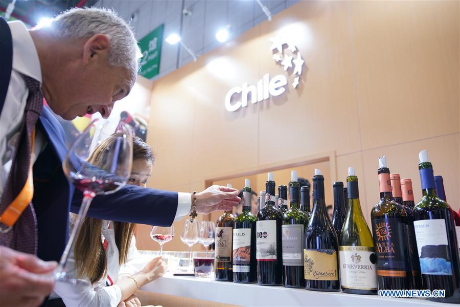 Δ?A man looks at wine from Chile at the first China International Import Expo in Shanghai, east China, Nov. 5, 2018. (Photo/Xinhua)