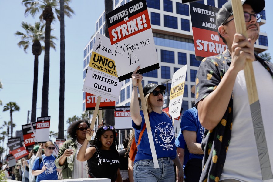 Entertainment industry writers demonstrate in Hollywood, Los Angeles, the United States, on May 2, 2023. (Photo/Xinhua)