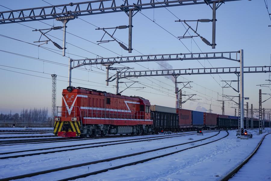 A China-Europe freight train bound for Kazakhstan passes through Horgos railway port in Horgos, northwest China’s Xinjiang Uygur Autonomous Region, Dec. 25, 2024. (Photo/Xinhua)