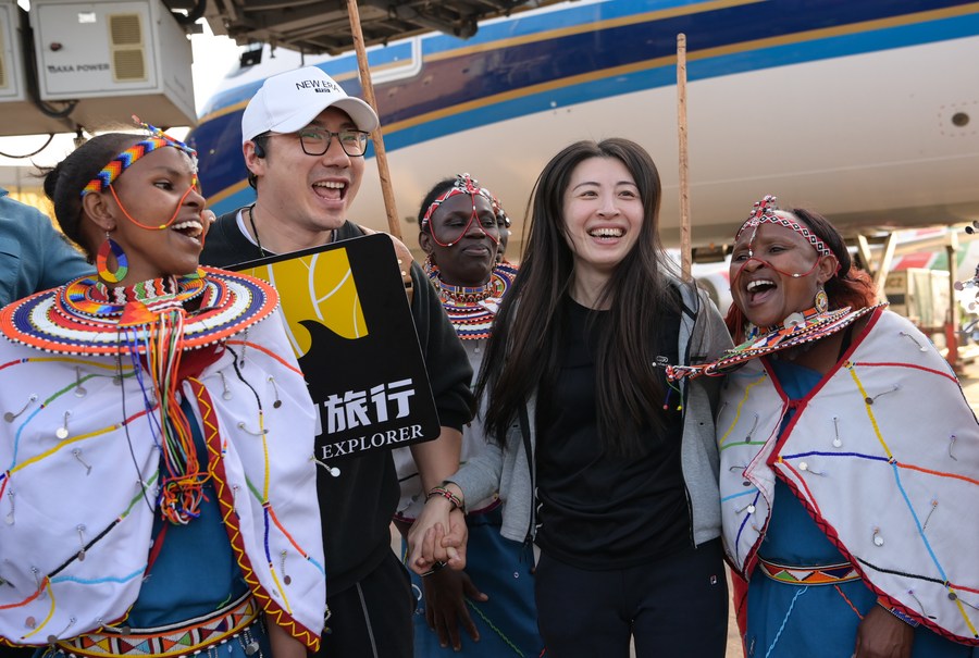 Chinese tourists interact with Maasai performers at Jomo Kenyatta International Airport in Nairobi, Kenya, Feb. 11, 2023. (Photo/Xinhua)