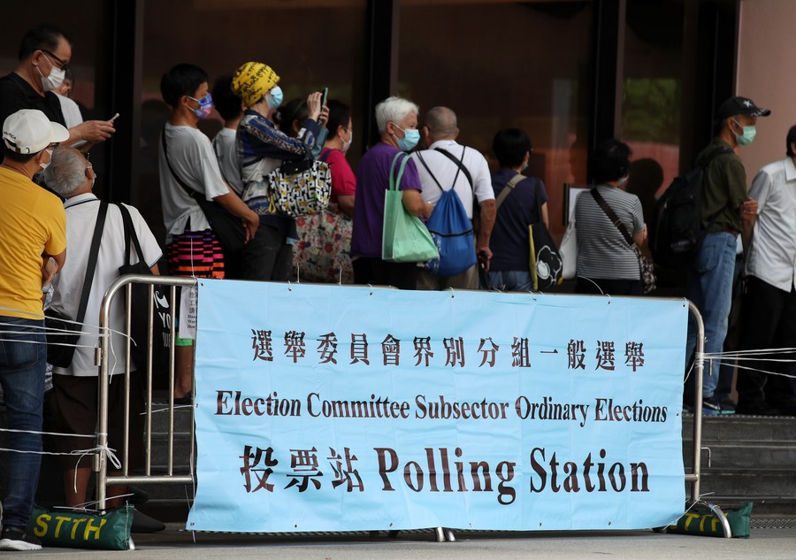 Citizens queue to enter a polling station at the Sha Tin Town Hall in south China’s Hong Kong, Sept. 19, 2021. (Photo/Xinhua)