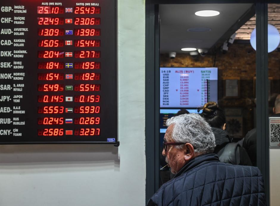 A man checks currency rates at an exchange office in Istanbul, Türkiye, May 29, 2023. (Photo/Xinhua)