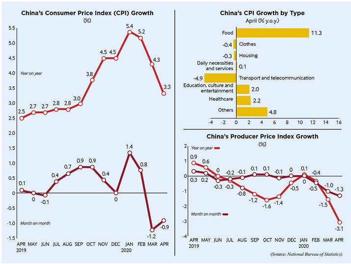 China suffered a 6.8 percent GDP fall in Q1, 2020, the first negative growth since 1976. There has been a solid rebound since April, with the industrial out added value grew 3.9 percent year-on-year. Retail sales for the month fell by 7.5 percent year-on-year, while the fall in Q1 was 16.1 percent. The fall in fixed investment also narrowed to 7.5 percent, compared to 16.1 percent in Q1. Export in April even registered an 8.2 percent growth over a year ago. The economic activity and output as a whole, however, has not recovered to the year-ago level.