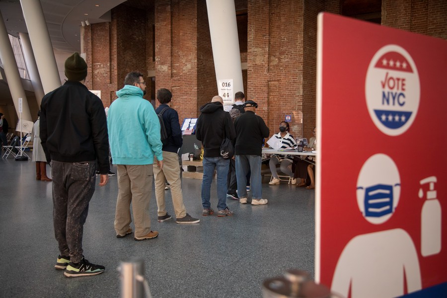 Voters line up to register at a polling station in New York, the United States, on Nov. 8, 2022. (Photo/Xinhua)